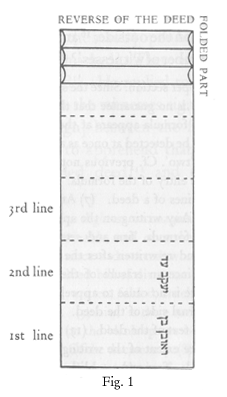 - They begin their signatures at the bottom of the reverse, on the back of the last line of the obverse, and proceed vertically upwards, witness after witness, towards the top line. Since the first signature commences at the foot of the deed, any matter below it (not having a signature on the reverse) would be easily detected as spurious.